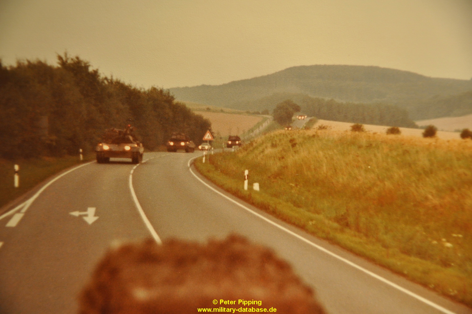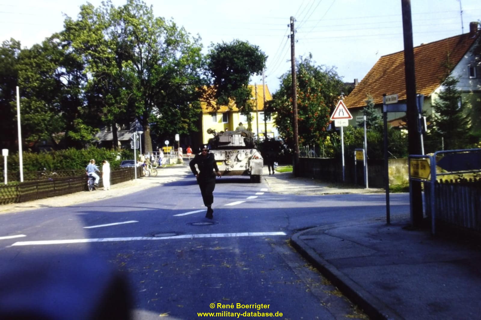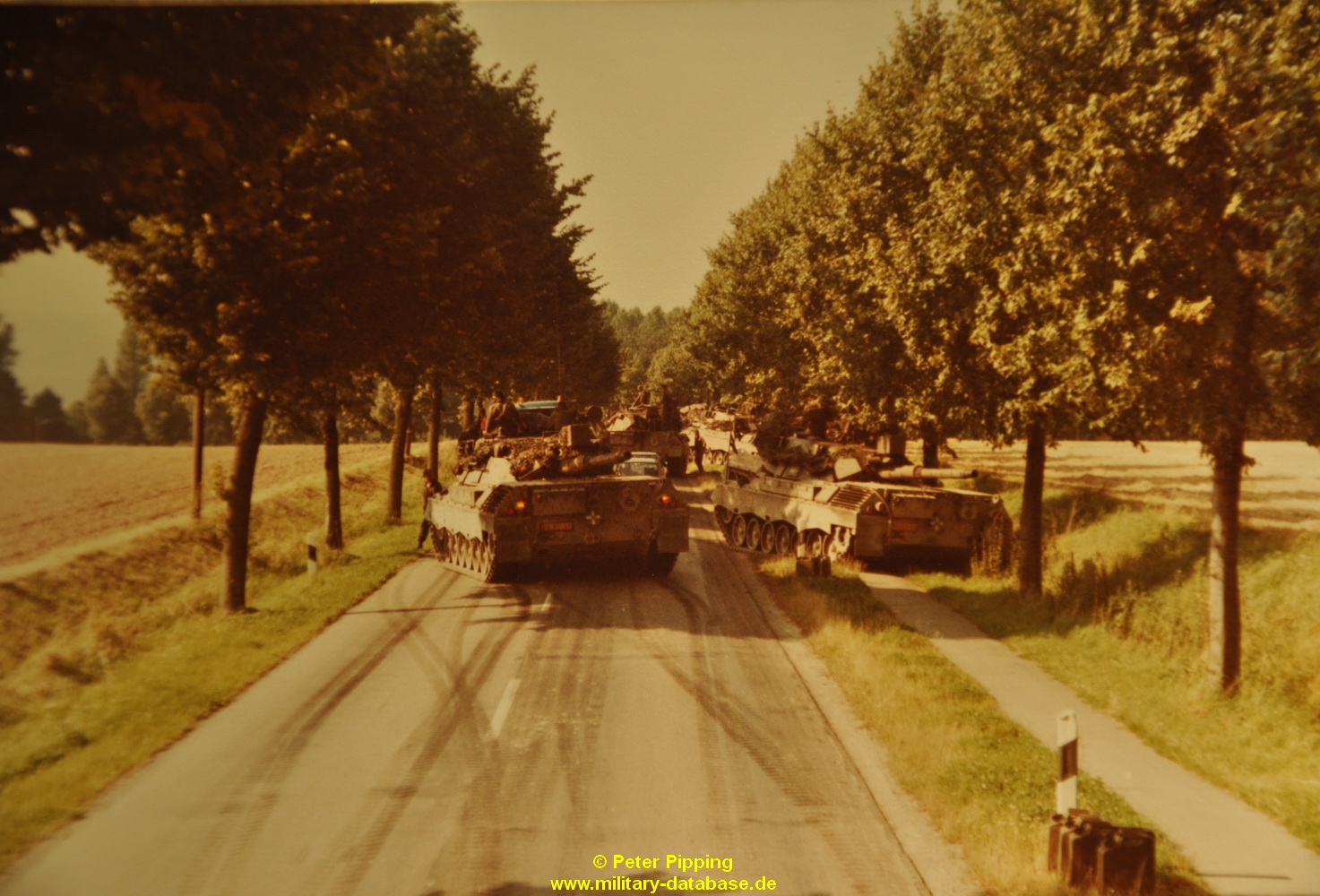 Das ganze noch ergänzt mit Jürgen seinen Bildern hatten wir mehr als wir uns jemals erhofft hatten. Ich kann mich noch gut erinnern wie die Jungs abgezogen sind. Die Mädchen waren tottraurig das die hübschen Männer jetzt weg sind, und wir, weil die Panzer weg waren 🙂 Wir sind mit dem Fahrrad noch bis nach Ahrenfeld und Heinsen hinterher. Sie hatten uns vorher die Route genannt, da sind wir mit den Fahrrädern vorweg gefahren. Kurz vor Ahrenfeld am Fuß des Thüster Berges waren sie dann schon hinter uns, ich schmiß mein Fahrrad an die Seite und stellte mich direkt an den Weg zum letzten Gruß wenn man so will. Da hätte es mich fast dahingerafft. Der erste Leopard rutschte in den Graben wo ich stand ( der konnte mich natürlich nicht sehen, ich stand zwischen den Hecken ) und ziehte das aber mal vollkommen durch. Knüppel, Äste und Erde flogen durch die Luft, und ich konnte nach hinten nicht weg, und der fuhr mit allem was das Boot hergab weiter. Ich war keine 10cm mit meinem Körper vom komplett durchdrehenden Panzer entfernt…das werde ich niemals vergessen. Danach sammelten sie sich nochmal in Ahrenfeld mitten im Ort am Kriegerdenkmal wo wir es gerad noch hinschafften, dann fuhren sie los und waren seit dem nicht mehr gesehen. Richtung Rittergut Heinsen, und dann vermutlich in Richtung Esbeck und weiter bis nach Eime.